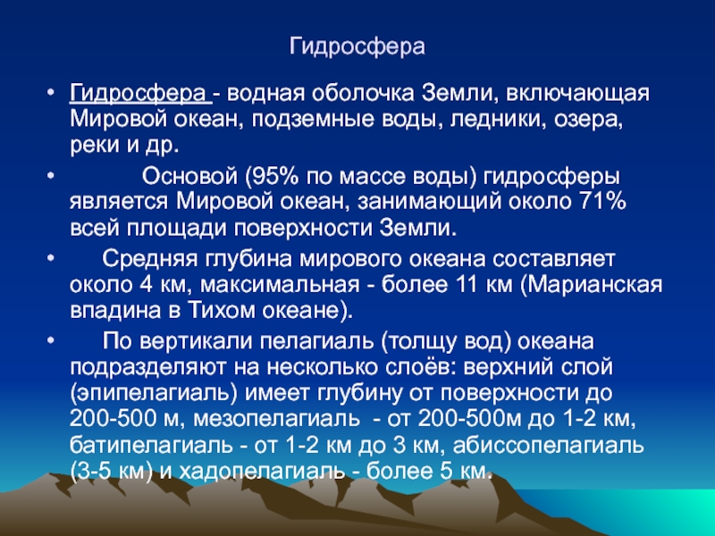 Гидросфера - водная оболочка Земли, включающая Мировой океан, подземные воды,
