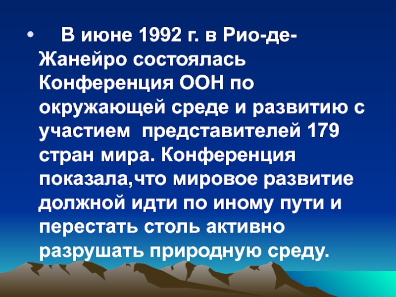 стран мира. Конференция показала,что мировое развитие должной идти по иному пути и перестать столь активно разрушать природную среду.