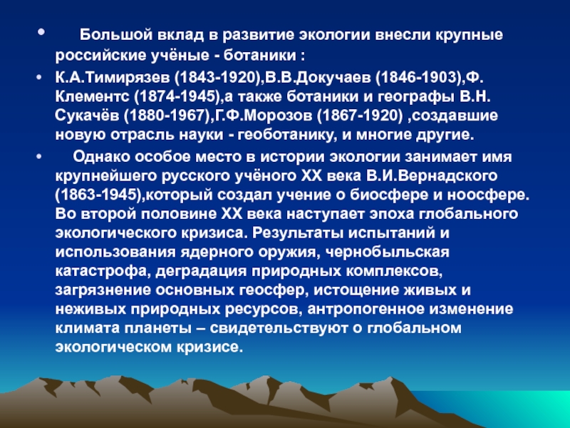 Слайд 12 Большой вклад в развитие экологии внесли крупные российские