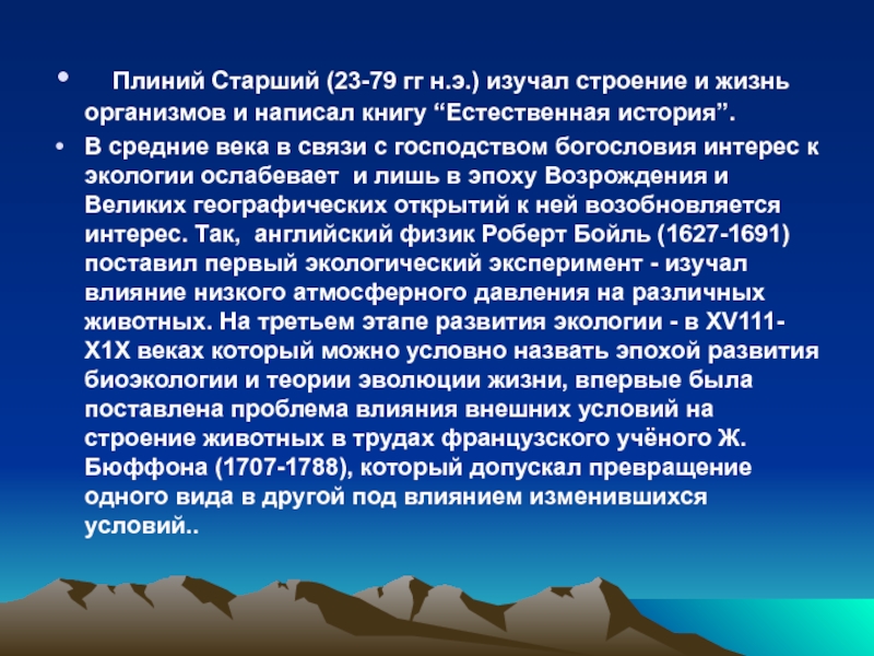 связи с господством богословия интерес к экологии ослабевает и лишь в эпоху Возрождения и Великих географических открытий к ней возобновляется интерес. Так, английский физик Роберт Бойль (1627-1691) поставил первый экологический эксперимент - изучал влияние низкого атмосферного давления на различных животных. На третьем этапе развития экологии - в ХV111-Х1Х веках который можно условно назвать эпохой развития биоэкологии и теории эволюции жизни, впервые была поставлена проблема влияния внешних условий на строение животных в трудах французского учёного Ж.Бюффона (1707-1788), который допускал превращение одного вида в другой под влиянием изменившихся условий..