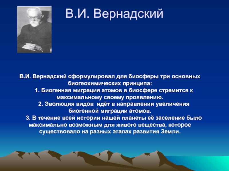 В.И. Вернадский сформулировал для биосферы три основных биогеохимических принципа: