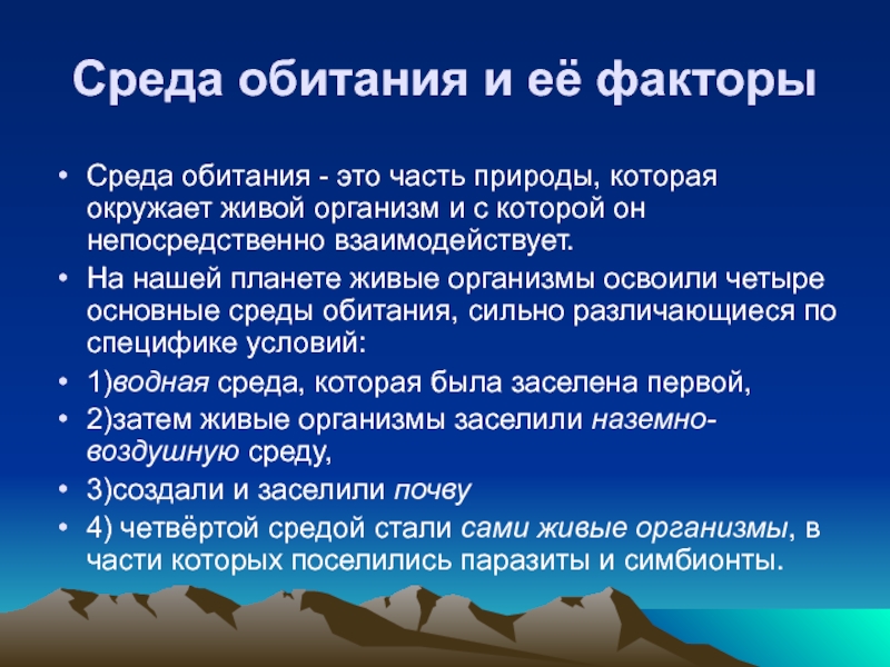 На нашей планете живые организмы освоили четыре основные среды обитания, сильно различающиеся по специфике условий: