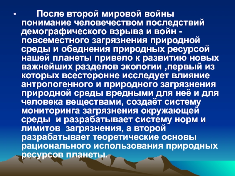 и обеднения природных ресурсой нашей планеты привело к развитию новых важнейших разделов экологии ,первый из которых всесторонне исследует влияние антропогенного и природного загрязнения природной среды вредными для неё и для человека веществами, создаёт систему мониторинга загрязнения окружающей среды и разрабатывает систему норм и лимитов загрязнения, а второй разрабатывает теоретические основы рационального использования природных ресурсов планеты.