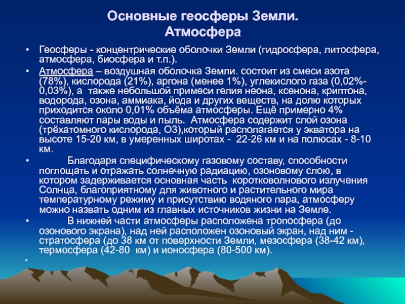 Геосферы - концентрические оболочки Земли (гидросфера, литосфера, атмосфера,