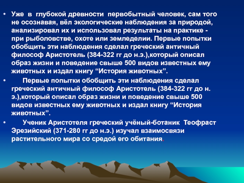 на практике - при рыболовстве, охоте или земледелии. Первые попытки обобщить эти наблюдения сделал греческий античный философ Аристотель (384-322 гг до н.э.),который описал образ жизни и поведение свыше 500 видов известных ему животных и издал книгу “История животных”.