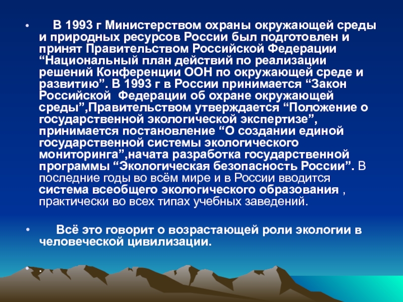 Федерации “Национальный план действий по реализации решений Конференции ООН по окружающей среде и развитию”. В 1993 г в России принимается “Закон Российской Федерации об охране окружающей среды”,Правительством утверждается “Положение о государственной экологической экспертизе”,принимается постановление “О создании единой государственной системы экологического мониторинга”,начата разработка государственной программы “Экологическая безопасность России”. В последние годы во всём мире и в России вводится система всеобщего экологического образования , практически во всех типах учебных заведений.