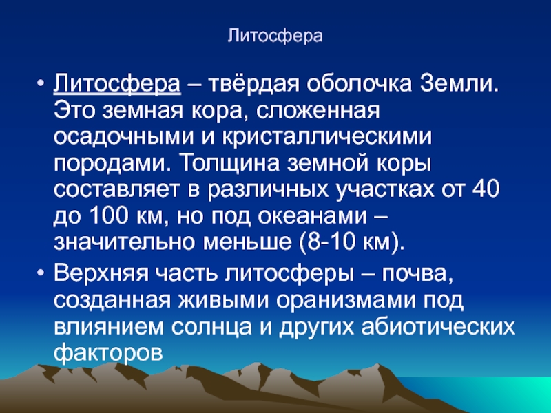 Литосфера – твёрдая оболочка Земли. Это земная кора, сложенная осадочными