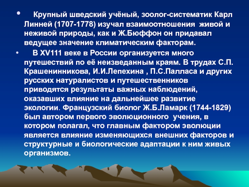 В ХV111 веке в России организуется много путешествий по её неизведанным краям. В трудах С.П.Крашенинникова, И.И.Лепехина , П.С.Палласа и других русских натуралистов и путешественников приводятся результаты важных наблюдений, оказавших влияние на дальнейшее развитие экологии. Французский биолог Ж.Б.Ламарк (1744-1829) был автором первого эволюционного учения, в котором полагал, что главным фактором эволюции является влияние изменяющихся внешних факторов и структурные и биологические адаптации к ним живых организмов.