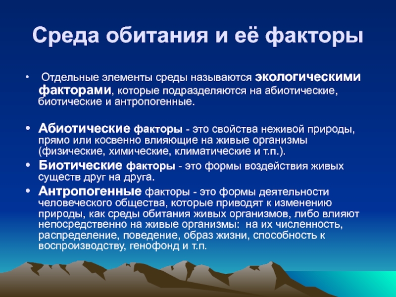 факторами, которые подразделяются на абиотические, биотические и антропогенные.