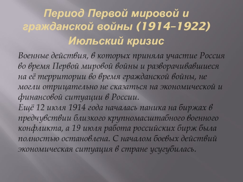 Ещё 12 июля 1914 года началась паника на биржах в предчувствии близкого крупномасштабного военного конфликта, а 19 июля работа российских бирж была полностью остановлена. С началом боевых действий экономическая ситуация в стране усугубилась.