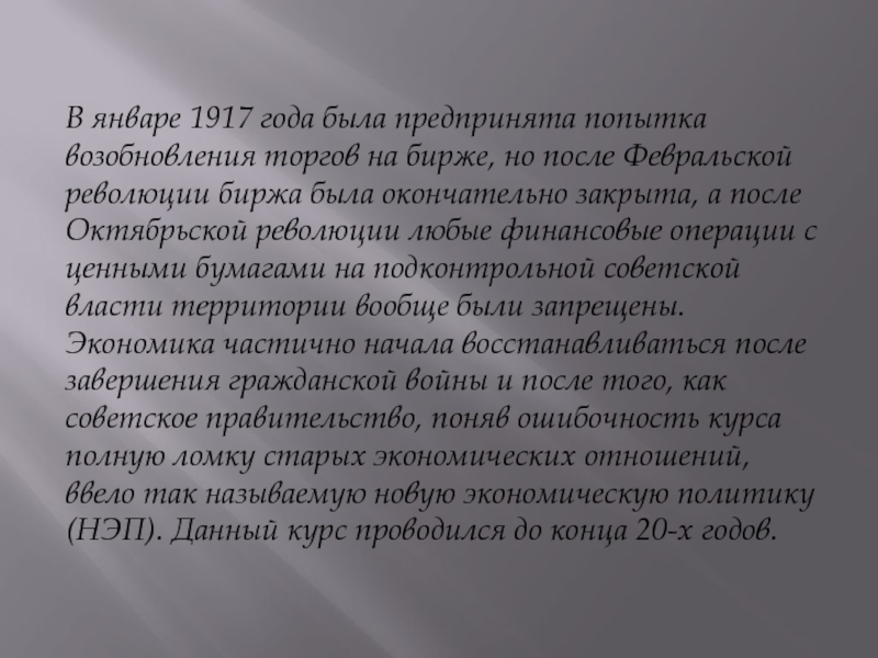 после Октябрьской революции любые финансовые операции с ценными бумагами на подконтрольной советской власти территории вообще были запрещены.