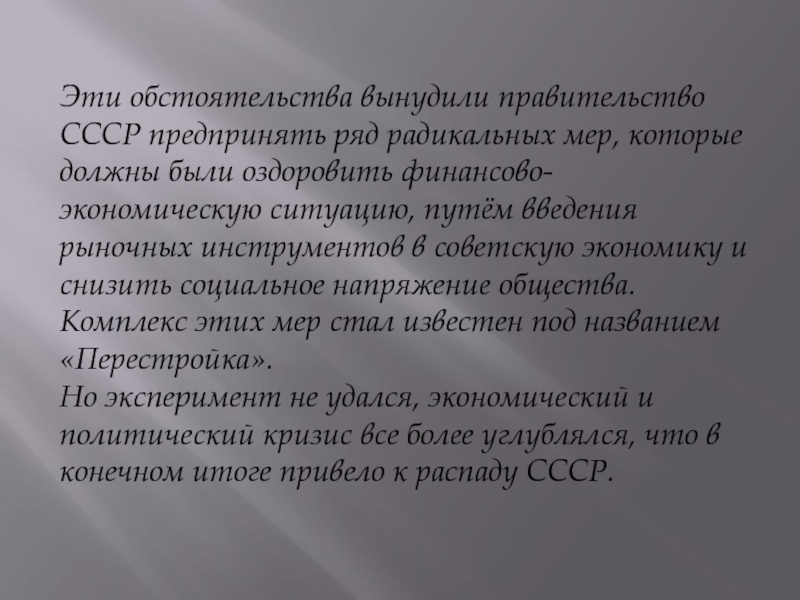 Слайд 11Эти обстоятельства вынудили правительство СССР предпринять ряд радикальных мер, которые