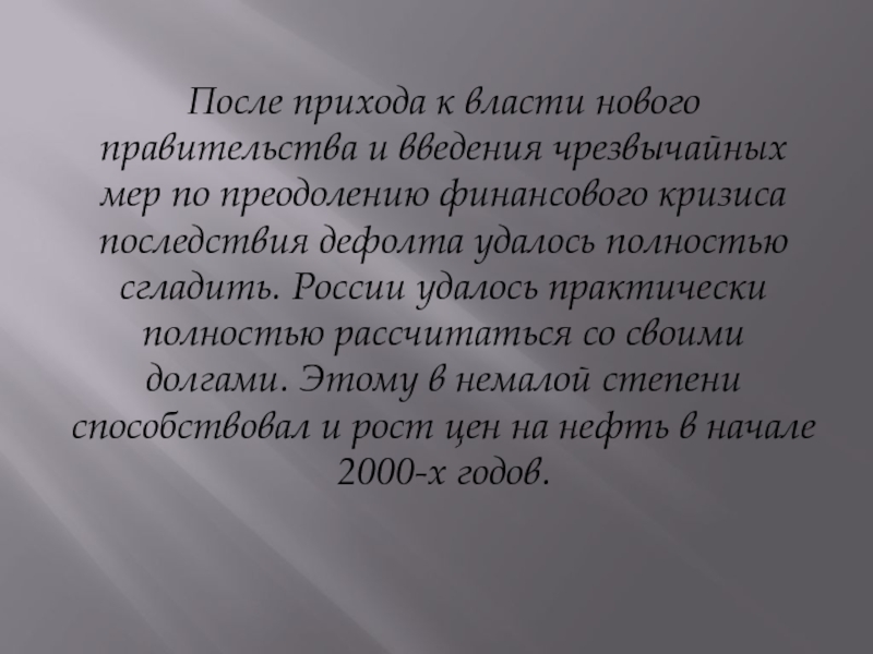 по преодолению финансового кризиса последствия дефолта удалось полностью сгладить. России