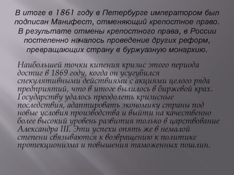 Государству удалось преодолеть кризисные последствия, адаптировать экономику страны под новые условия производства и выйти на качественно более высокий уровень развития только в царствование Александра III. Эти успехи опять же в немалой степени связываются к возвращению к политике протекционизма и повышения таможенных пошлин.