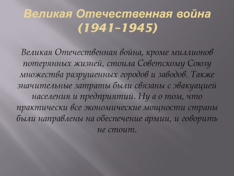 стоила Советскому Союзу множества разрушенных городов и заводов. Также значительные