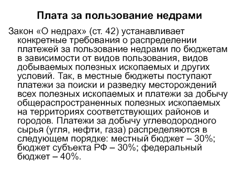 зависимости от видов пользования, видов добываемых полезных ископаемых и других условий. Так, в местные бюджеты поступают платежи за поиски и разведку месторождений всех полезных ископаемых и платежи за добычу общераспространенных полезных ископаемых на территориях соответствующих районов и городов. Платежи за добычу углеводородного сырья (угля, нефти, газа) распределяются в следующем порядке: местный бюджет – 30%; бюджет субъекта РФ – 30%; федеральный бюджет – 40%.