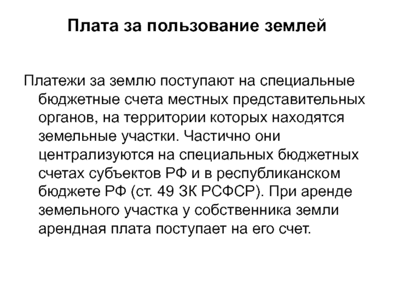 Частично они централизуются на специальных бюджетных счетах субъектов РФ и в республиканском бюджете РФ (ст. 49 ЗК РСФСР). При аренде земельного участка у собственника земли арендная плата поступает на его счет.