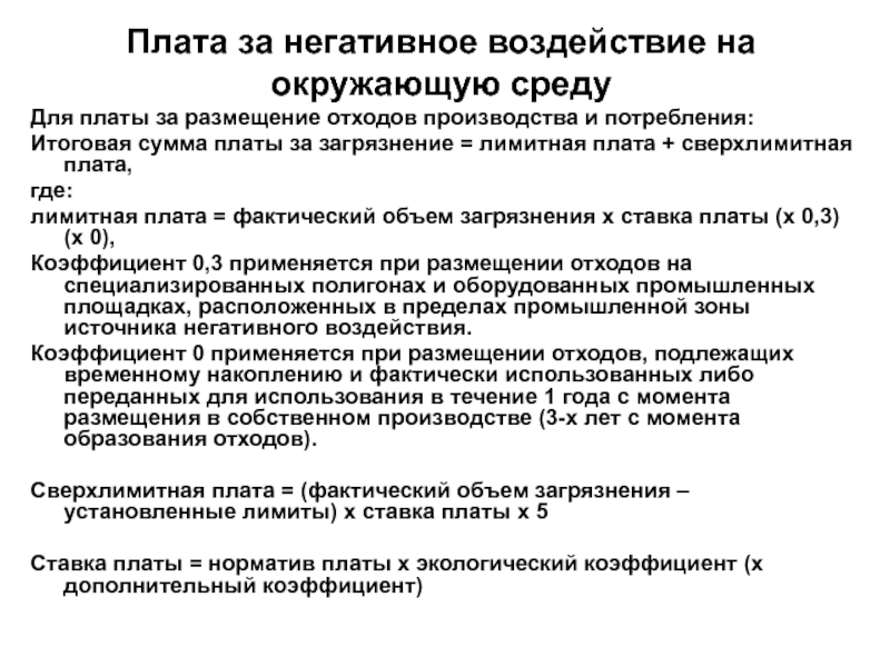 веществ, размещение отходов вся масса загрязняющих веществ учитывается как сверхлимитная. Плата за загрязнение окружающей среды в данном случае исчисляется в порядке, аналогичном исчислению сверхлимитной платы.