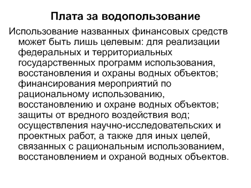 использования, восстановления и охраны водных объектов. Регулируется платность природопользования в