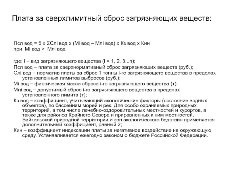Слайд 57Плата за сверхлимитный сброс загрязняющих веществ: