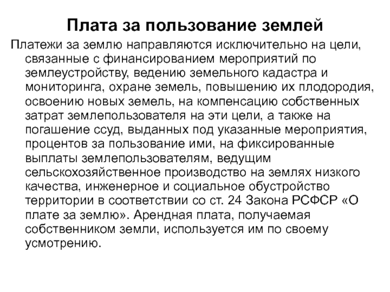 мониторинга, охране земель, повышению их плодородия, освоению новых земель, на компенсацию собственных затрат землепользователя на эти цели, а также на погашение ссуд, выданных под указанные мероприятия, процентов за пользование ими, на фиксированные выплаты землепользователям, ведущим сельскохозяйственное производство на землях низкого качества, инженерное и социальное обустройство территории в соответствии со ст. 24 Закона РСФСР «О плате за землю». Арендная плата, получаемая собственником земли, используется им по своему усмотрению.