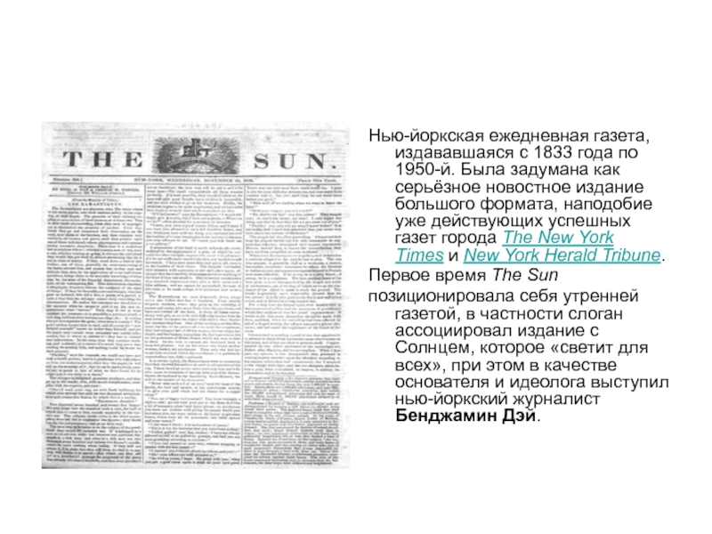 Слайд 4Нью-йоркская ежедневная газета, издававшаяся с 1833 года по 1950-й. Была