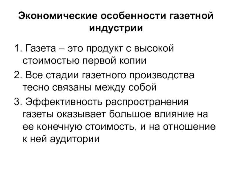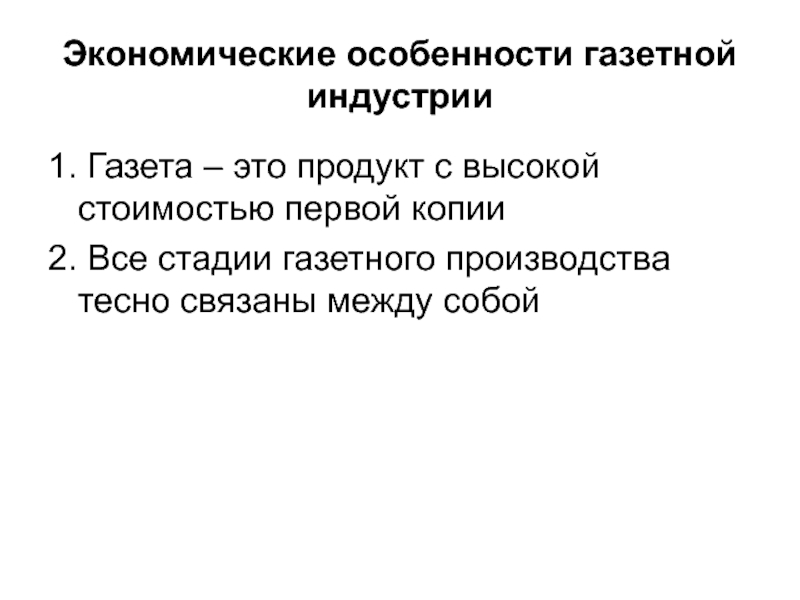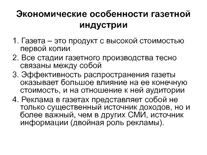 Слайд 12Экономические особенности газетной индустрии