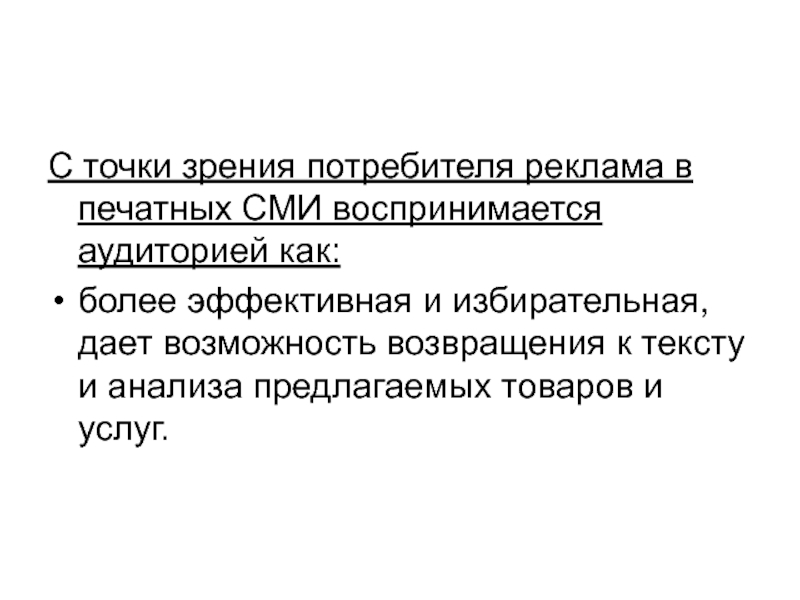 Слайд 18С точки зрения потребителя реклама в печатных СМИ воспринимается аудиторией