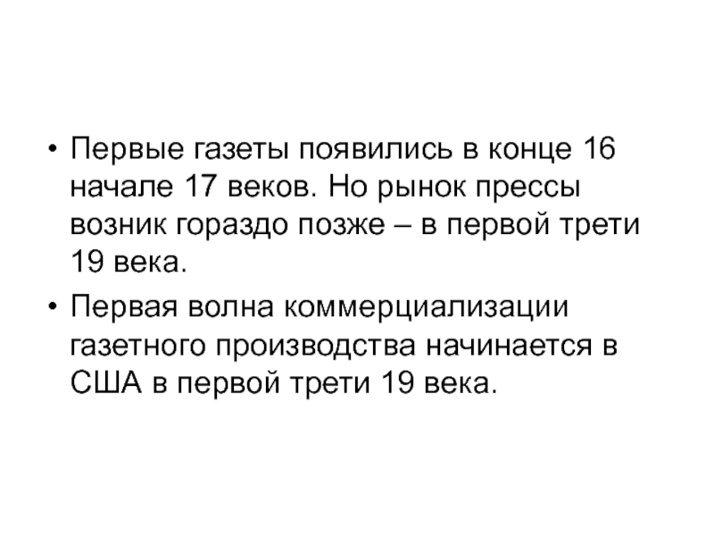 Первая волна коммерциализации газетного производства начинается в США в первой трети 19 века.