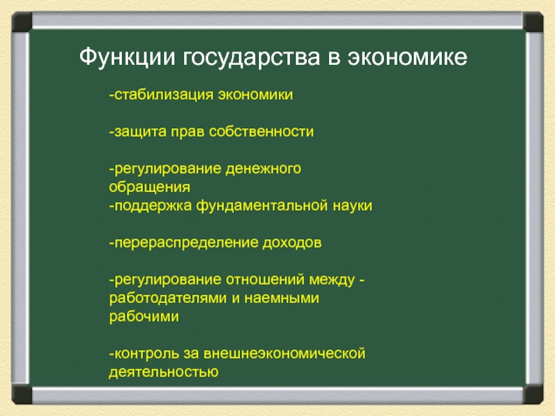 -стабилизация экономики-защита прав собственности-регулирование денежного обращения-поддержка фундаментальной науки-перераспределение доходов-регулирование отношений между -работодателями и наемными рабочими-контроль за внешнеэкономической