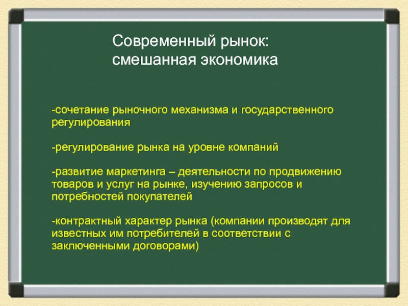 Современный рынок: смешанная экономика-сочетание рыночного механизма и государственного регулирования-регулирование рынка на уровне компаний-развитие маркетинга – деятельности по
