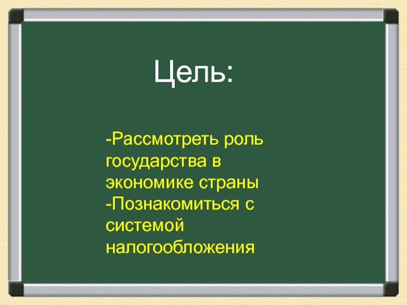 -Рассмотреть роль государства в экономике страны-Познакомиться с системой налогообложенияЦель: