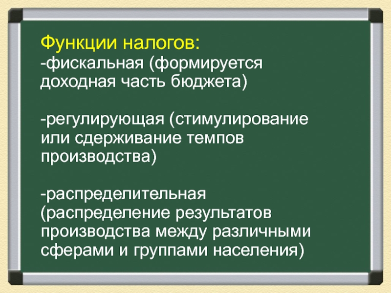 Функции налогов:-фискальная (формируется доходная часть бюджета)-регулирующая (стимулирование или сдерживание темпов производства)-распределительная (распределение результатов производства между различными сферами