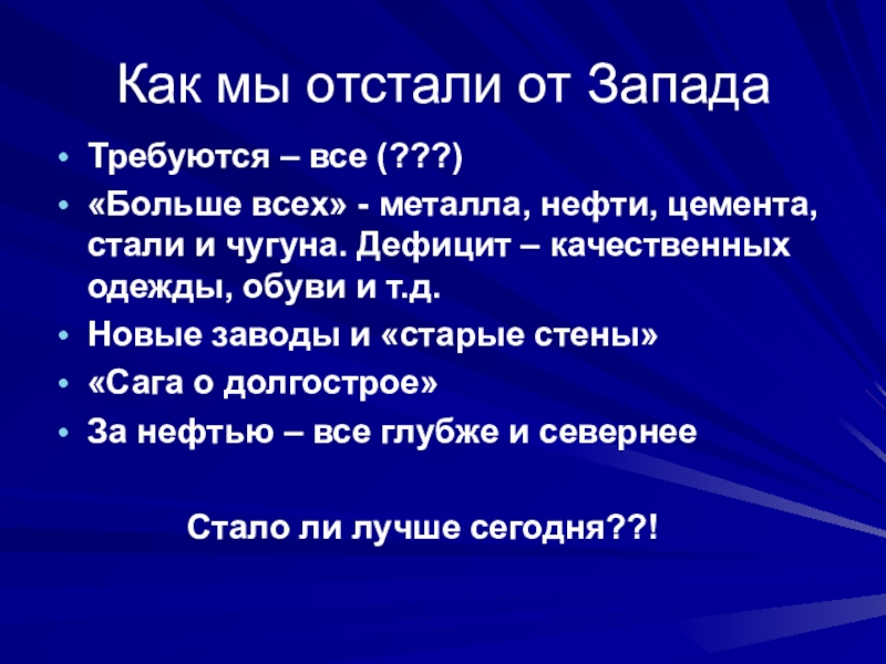 металла, нефти, цемента, стали и чугуна. Дефицит – качественных одежды,