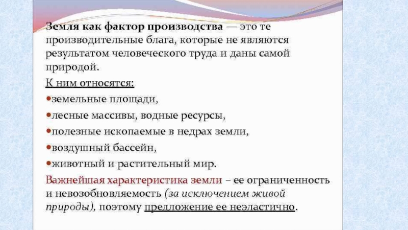 3) Все виды природных ресурсов, имеющихся на планете и пригодных для производства экономических благ, определяют содержание такого фактора производства, как земля.
