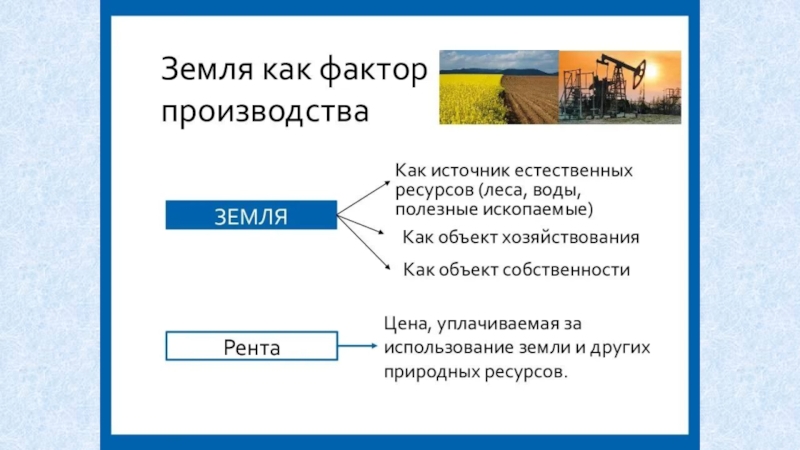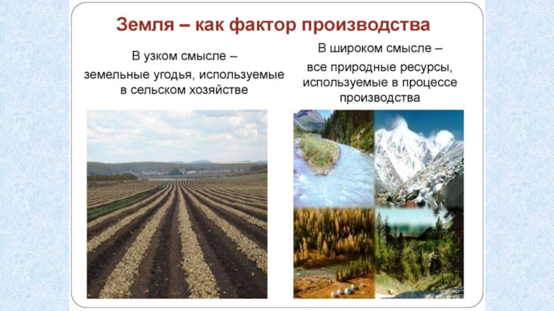 2) Земля как фактор производства отражает влияние природных условий на производственные процессы, использование в производстве природных источников сырья и энергии, полезных ископаемых, земельных и водных ресурсов, воздушного бассейна, природной флоры и фауны.