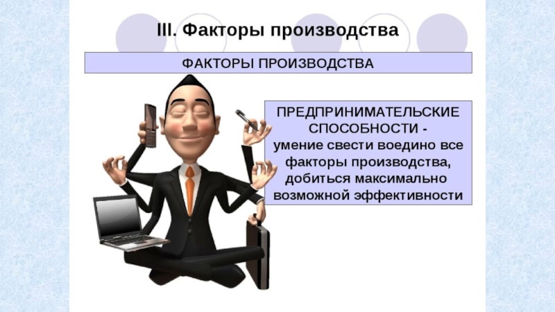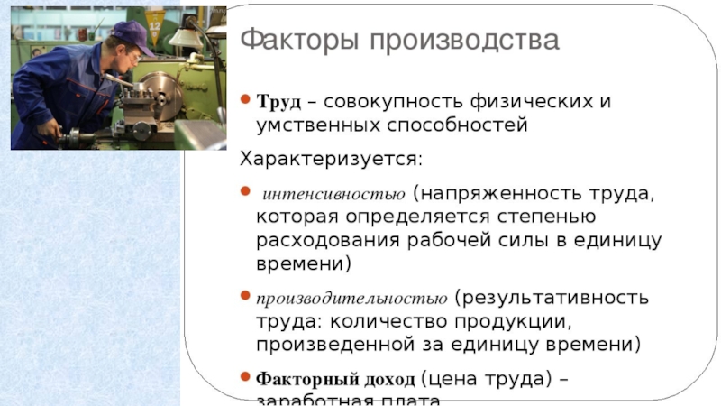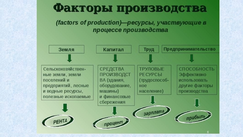 4) Факторы производства — это основные компоненты, используемые в процессе производства продукции, работ, услуг.