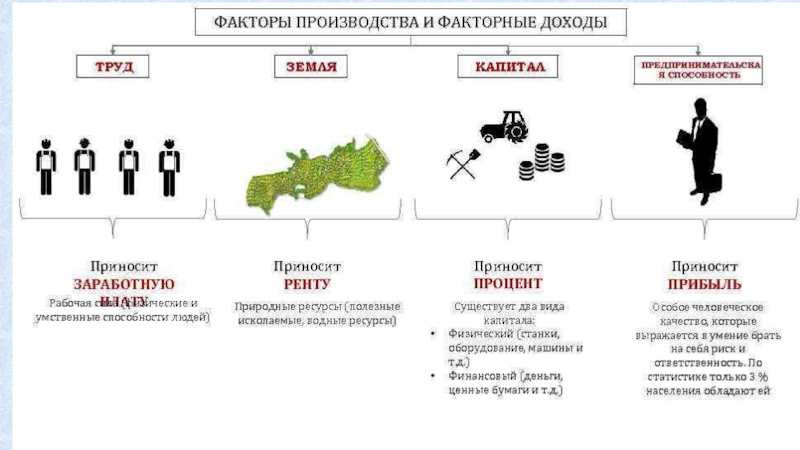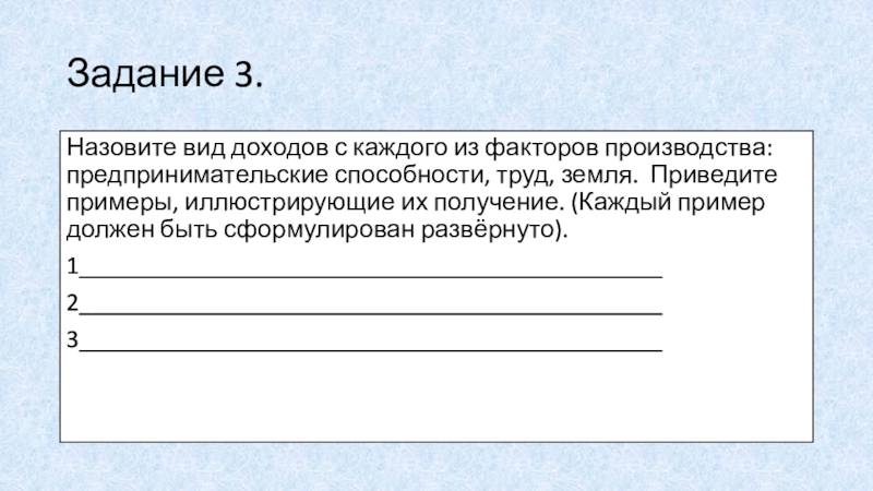 Задание 3.Назовите вид доходов с каждого из факторов производства: предпринимательские способности, труд, земля. Приведите примеры, иллюстрирующие их