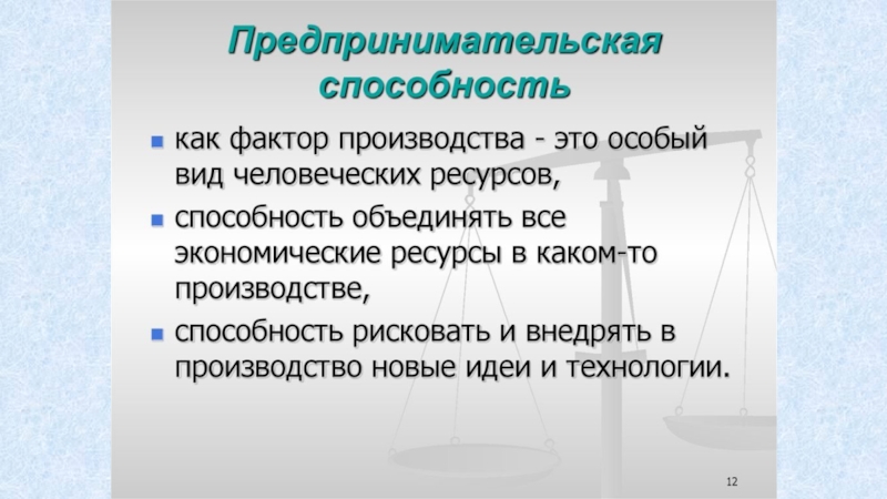 особые способности человека правильно оценить спрос, скоординировать использование ресурсов и принять на себя риск потери вложенных в дело средств.