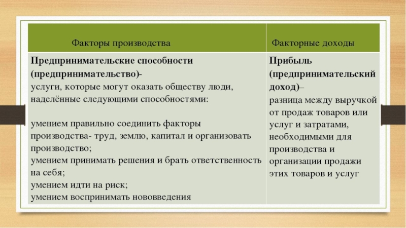Назовите вид доходов с каждого из факторов производства: предпринимательские