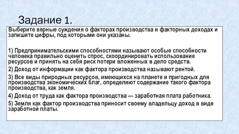 Задание 1.Выберите верные суждения о факторах производства и факторных доходах и запишите цифры, под которыми они указаны.1)