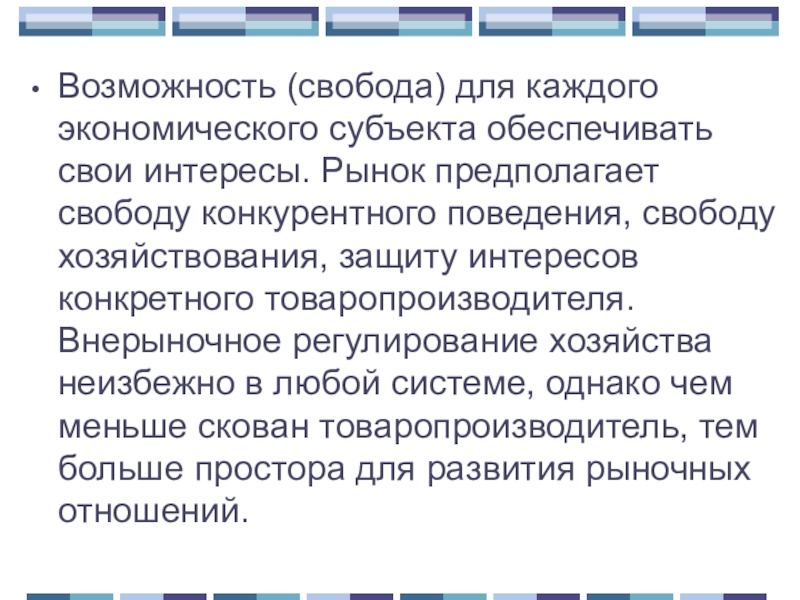 Слайд 7Возможность (свобода) для каждого экономического субъекта обеспечивать свои интересы. Рынок