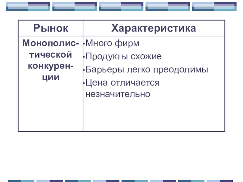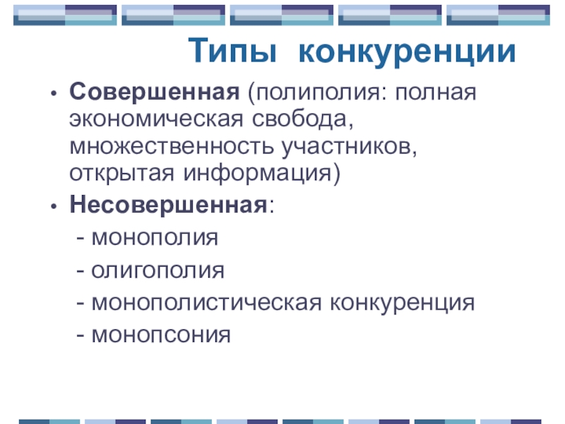 По типу конкуренции: свободной (чистой) конкуренции, несовершенной конкуренции
