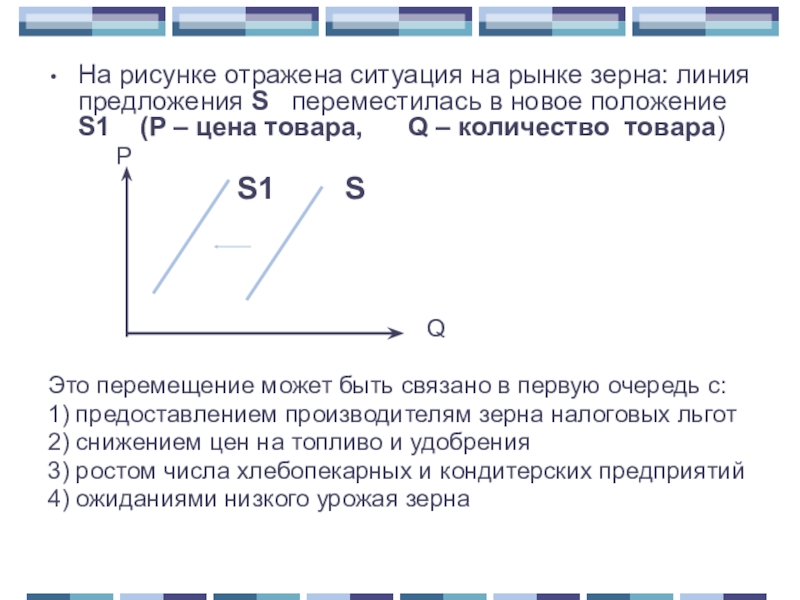 Слайд 34На рисунке отражена ситуация на рынке зерна: линия предложения S