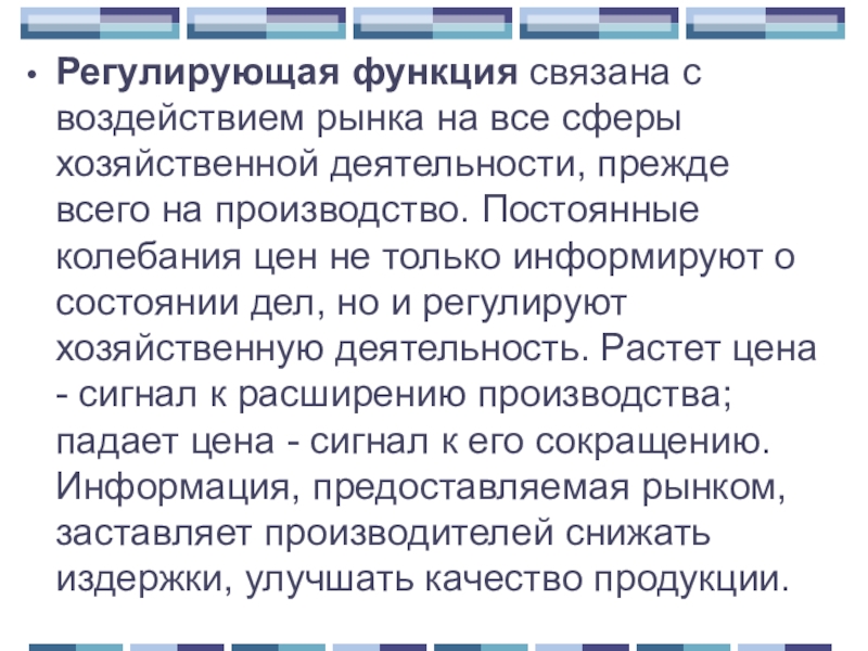 Слайд 18Регулирующая функция связана с воздействием рынка на все сферы хозяйственной