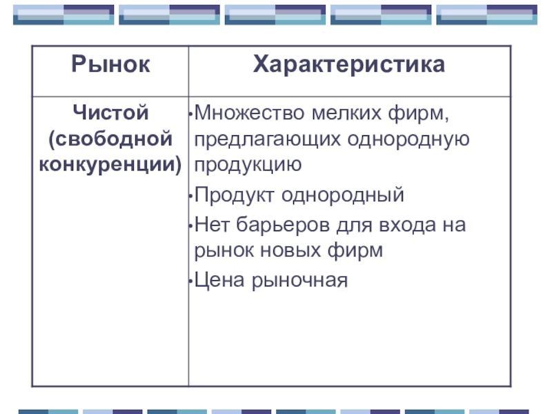 Совершенная (полиполия: полная экономическая свобода, множественность участников, открытая информация)