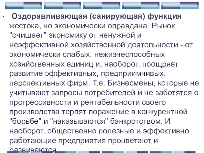 Слайд 23 Оздоравливающая (санирующая) функция жестока, но экономически оправдана. Рынок "очищает"