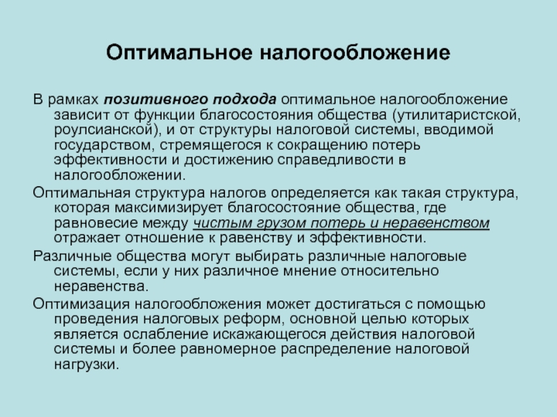 Оптимизация налогообложения может достигаться с помощью проведения налоговых реформ, основной целью которых является ослабление искажающегося действия налоговой системы и более равномерное распределение налоговой нагрузки.