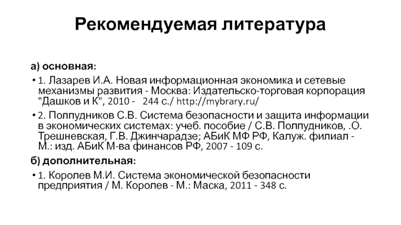 1. Королев М.И. Система экономической безопасности предприятия / М. Королев - М.: Маска, 2011 - 348 с.