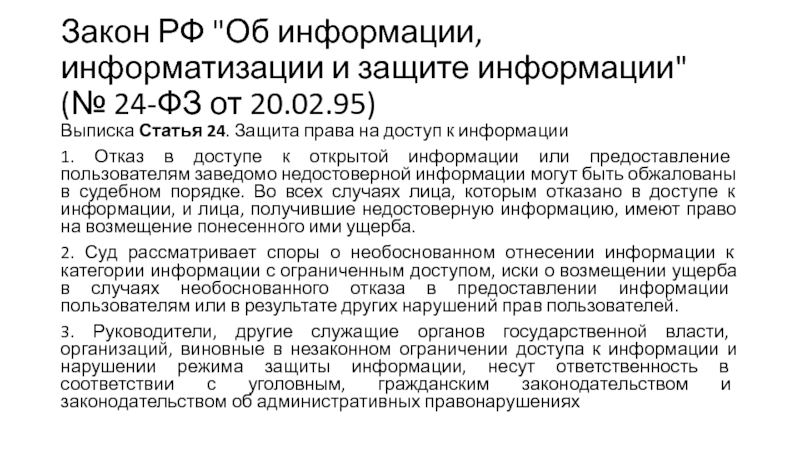 Слайд 13Закон РФ "Об информации, информатизации и защите информации" (№ 24-ФЗ